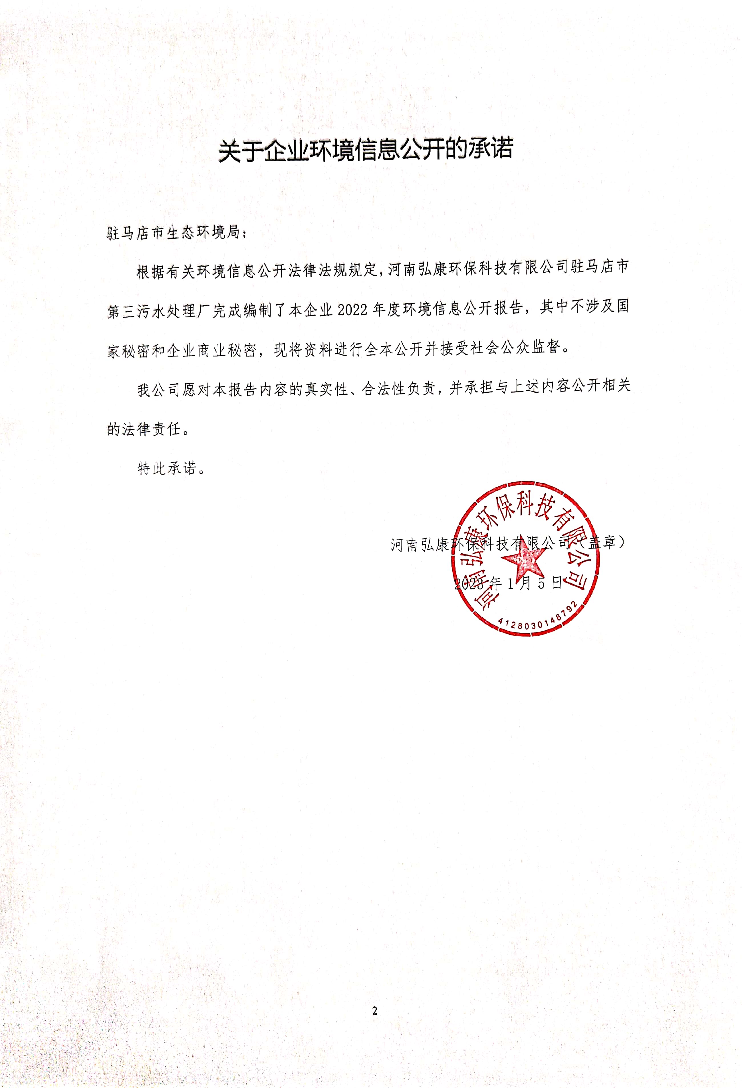 河南弘康環(huán)??萍加邢薰抉v馬店市第三污水處理廠2022年度環(huán)境信息公開報(bào)告